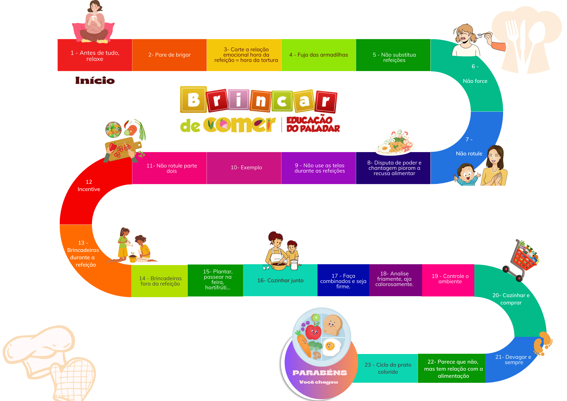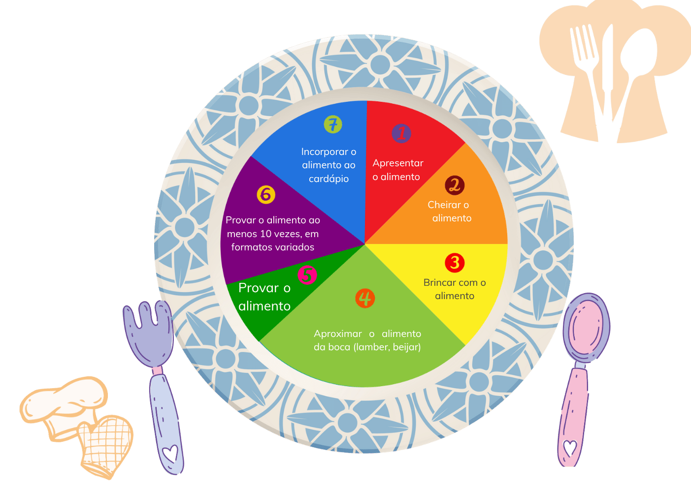 Onde encontrará os 7 passos entre a recusa de um alimento e sua incorporação ao cardápio cotidiano da criança. Essas são ferramentas especificamente desenvolvidas pra fazer com que essa jornada de desenvolvimento do paladar seja muito simples, visual e fácil de aplicar no seu cotidiano corrido.